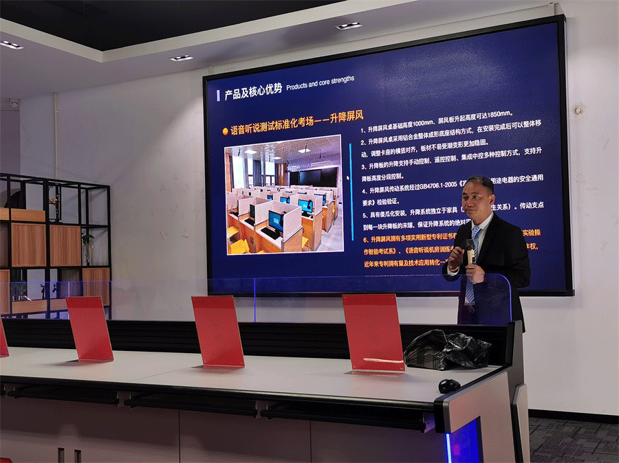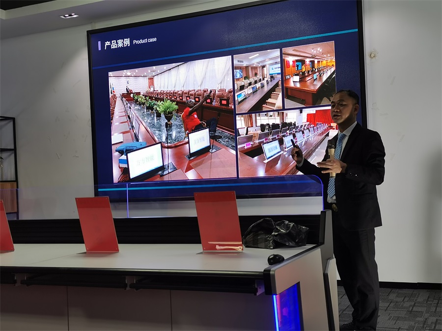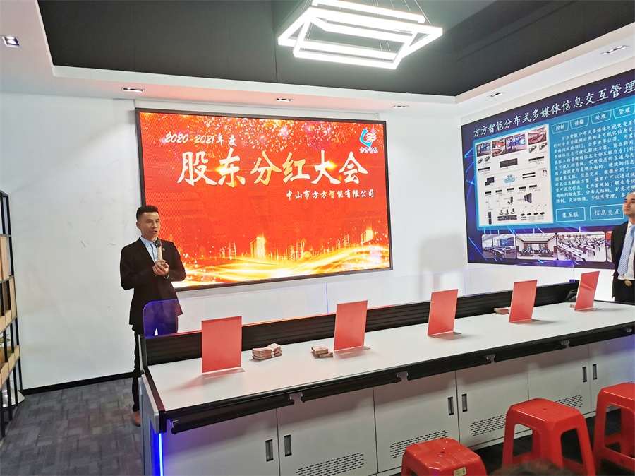 何廣真董事長會上致辭,分享了從辦公家具行業跨行業進入智能家具行業。講述了公司產品的核心優勢,分析了智能市場規模及未來行業發展,以及公司未來五年規劃,3-5年將完成公司上市,做全球最大的商務空間設備集成平臺。